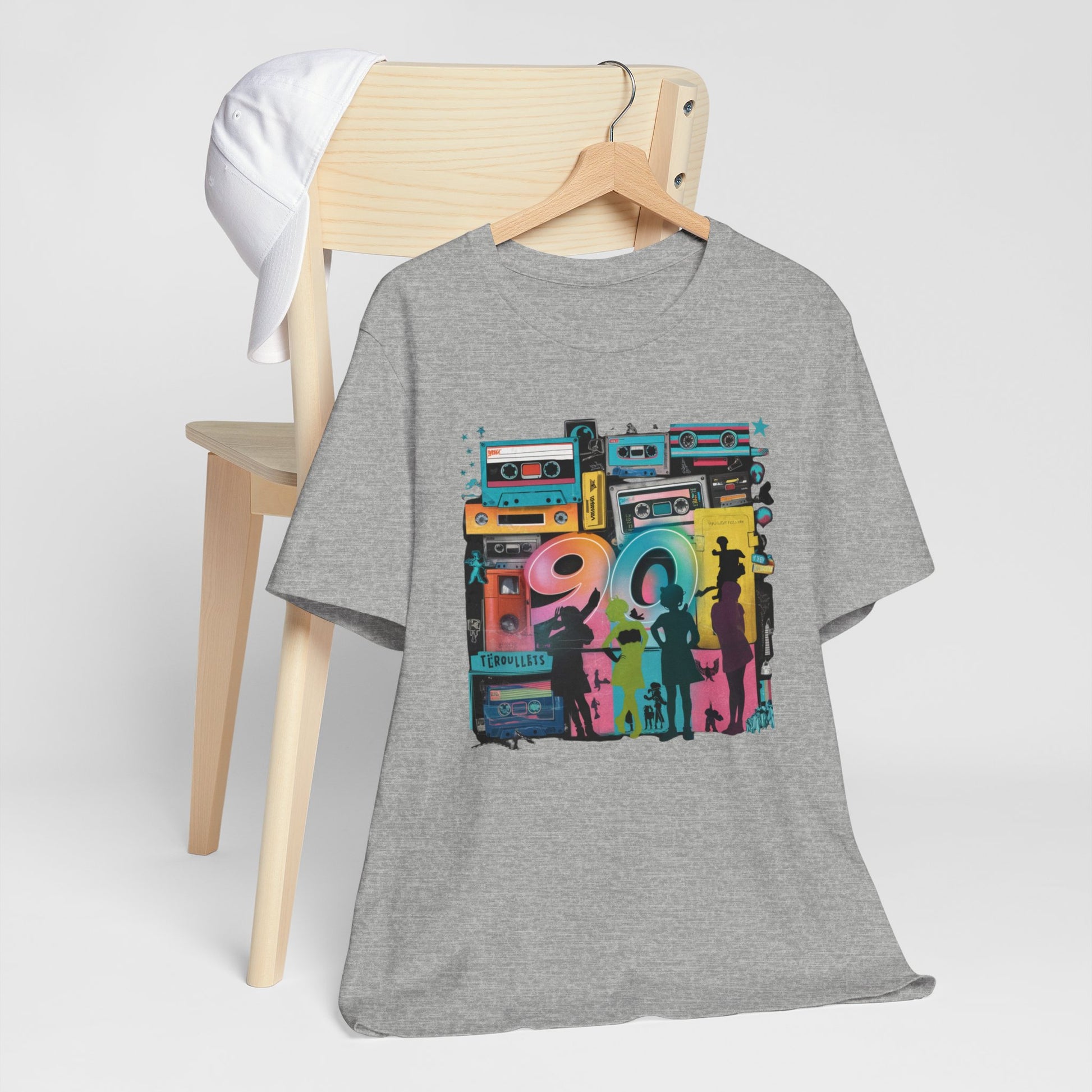 Embrace the vibrant energy of the 1990s with this "Retro Mixed Media" t-shirt, showcasing iconic elements of pop culture and street style. Perfect for fans of bold urban art and nostalgic designs, this shirt celebrates the colorful and dynamic era of mixtapes, boomboxes, and graffiti.