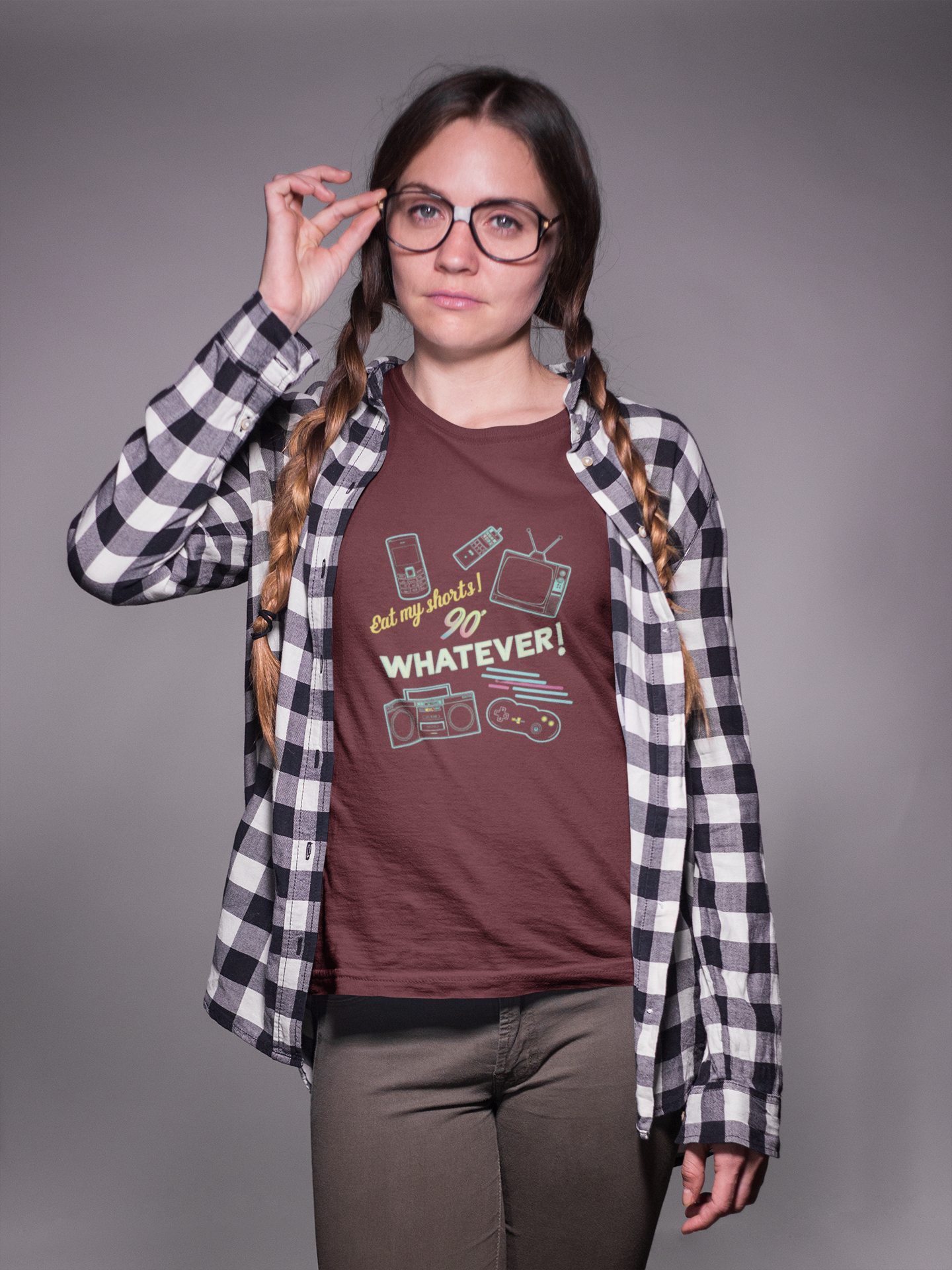 Step back into the vibrant 1990s with this "Retro 90s Slang" t-shirt, perfect for nostalgic souls. Featuring iconic phrases like "Eat my shorts" and "Whatever," along with old-school gadgets like mobile phones and boomboxes, this colorful and playful design captures the essence of vintage, neon-era fun.