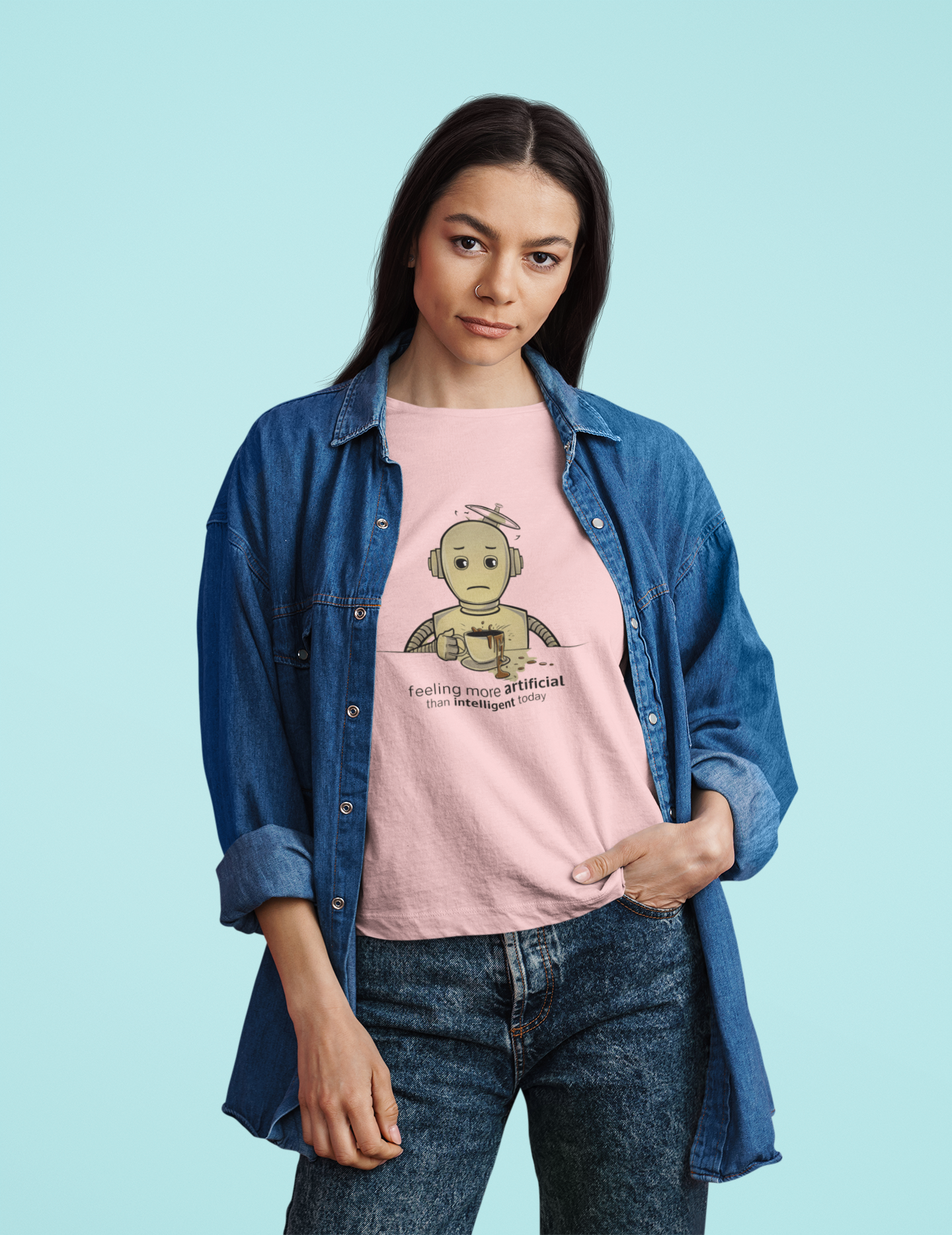This design humorously captures the vibe of feeling more artificial than intelligent, with a quirky robot spilling its coffee. Perfect for those who love a playful twist on technology.