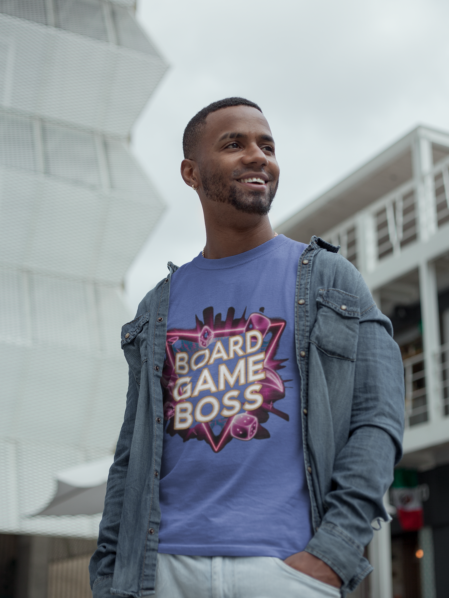 Show off your gaming prowess with the "Board Game Boss" retro neon tshirt. Perfect for game nights with family and friends, this vibrant and glossy design captures the excitement of classic competition.