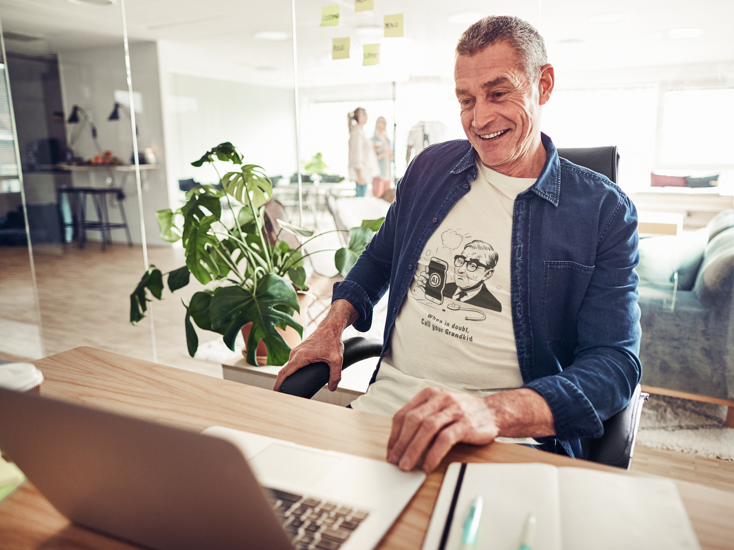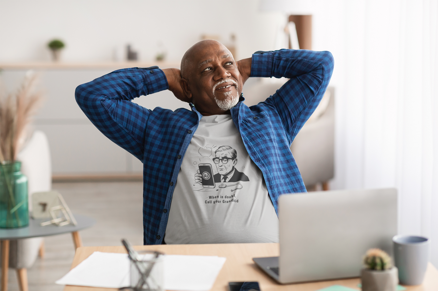 This design humorously captures the struggles of a grandad trying to use a cell phone, perfect for bringing a smile to the face of any grandparent. The sketch illustration and real-life situation phrase, "When in Doubt Call Your Grand Kid," make it an ideal gift for those who appreciate a good laugh.