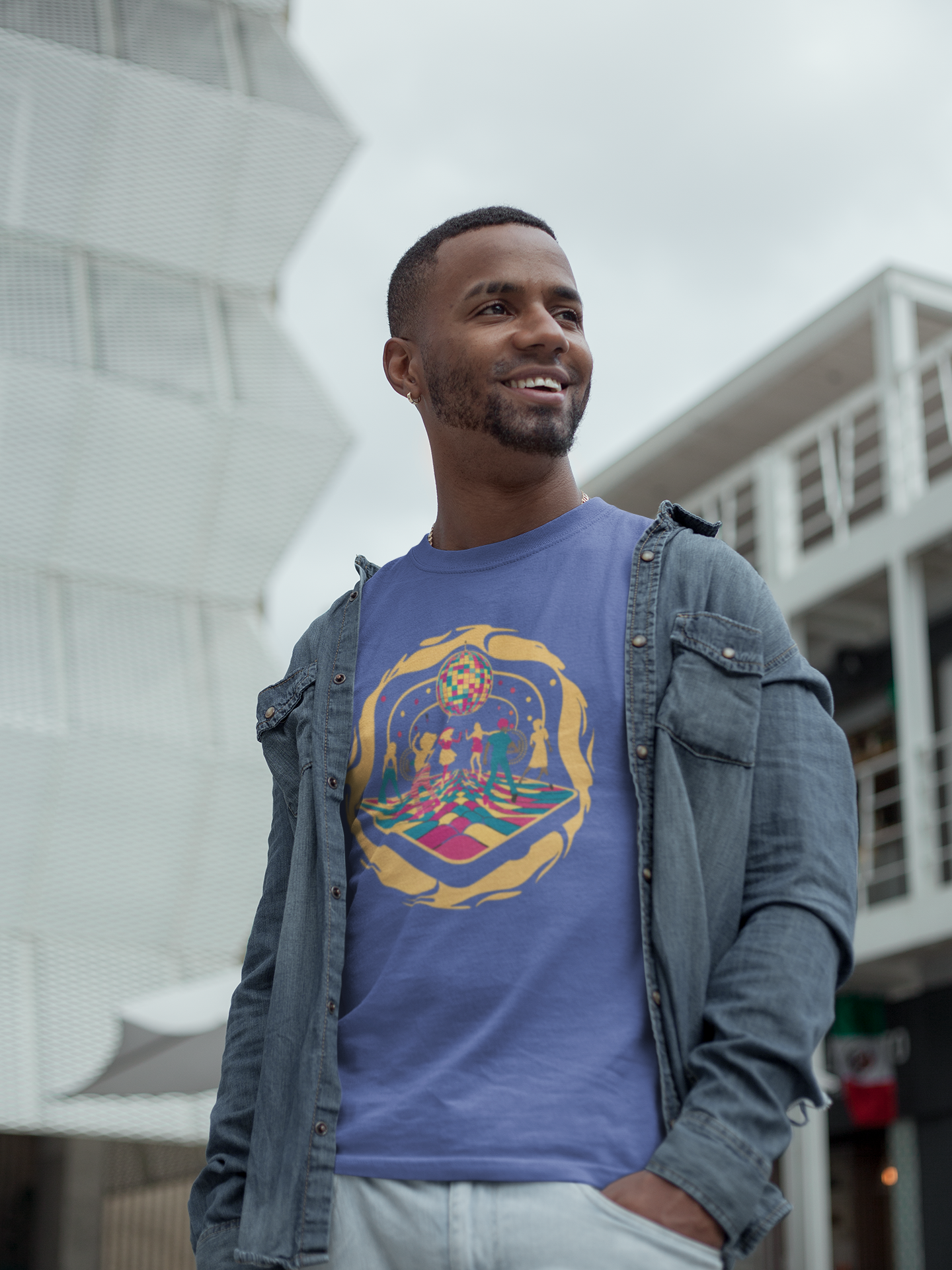 This vibrant disco retro design captures the bold energy of the dancefloor with abstract pop art elements. Featuring groovy dancers and a mirror ball, it’s perfect for music and party lovers.