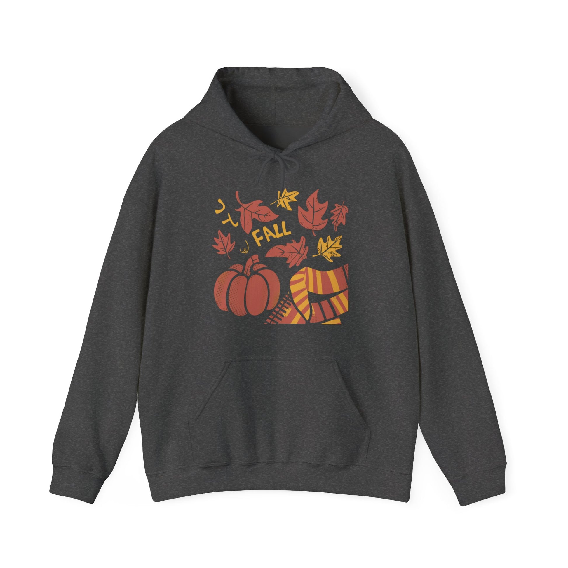 This design features a retro vintage abstract theme with autumn leaves, pumpkins, and scarves in warm colors of orange, yellow, and red. Perfect for October and November, it combines mid-century modern aesthetics with nature-inspired patterns, making it an ideal decoration for Thanksgiving and the fall season.