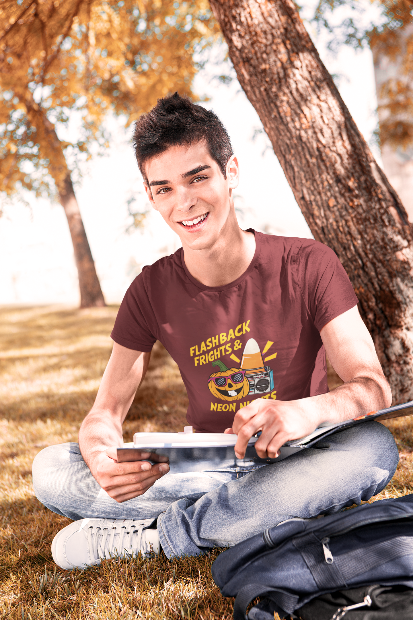 Celebrate Halloween with a flashback to the 80s in this vibrant design featuring pumpkins candy corn and neon nights. Perfect for retro enthusiasts this design brings the nostalgia of 80s Halloween into your wardrobe.