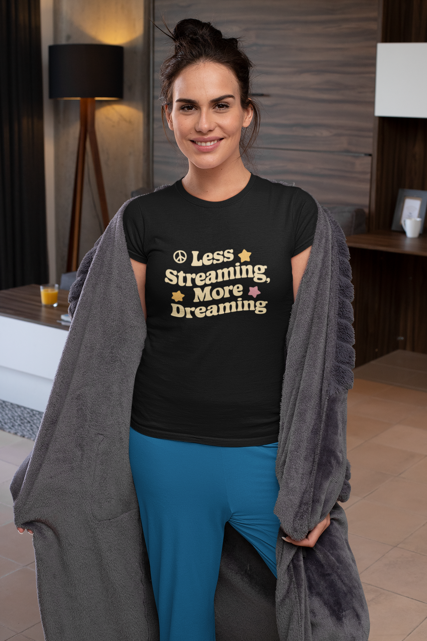 This design features the phrase "Less Streaming, More Dreaming" in a retro 70s style with a dreamy, motivational message. It’s perfect for anyone who values disconnecting and finding peace in simpler moments.