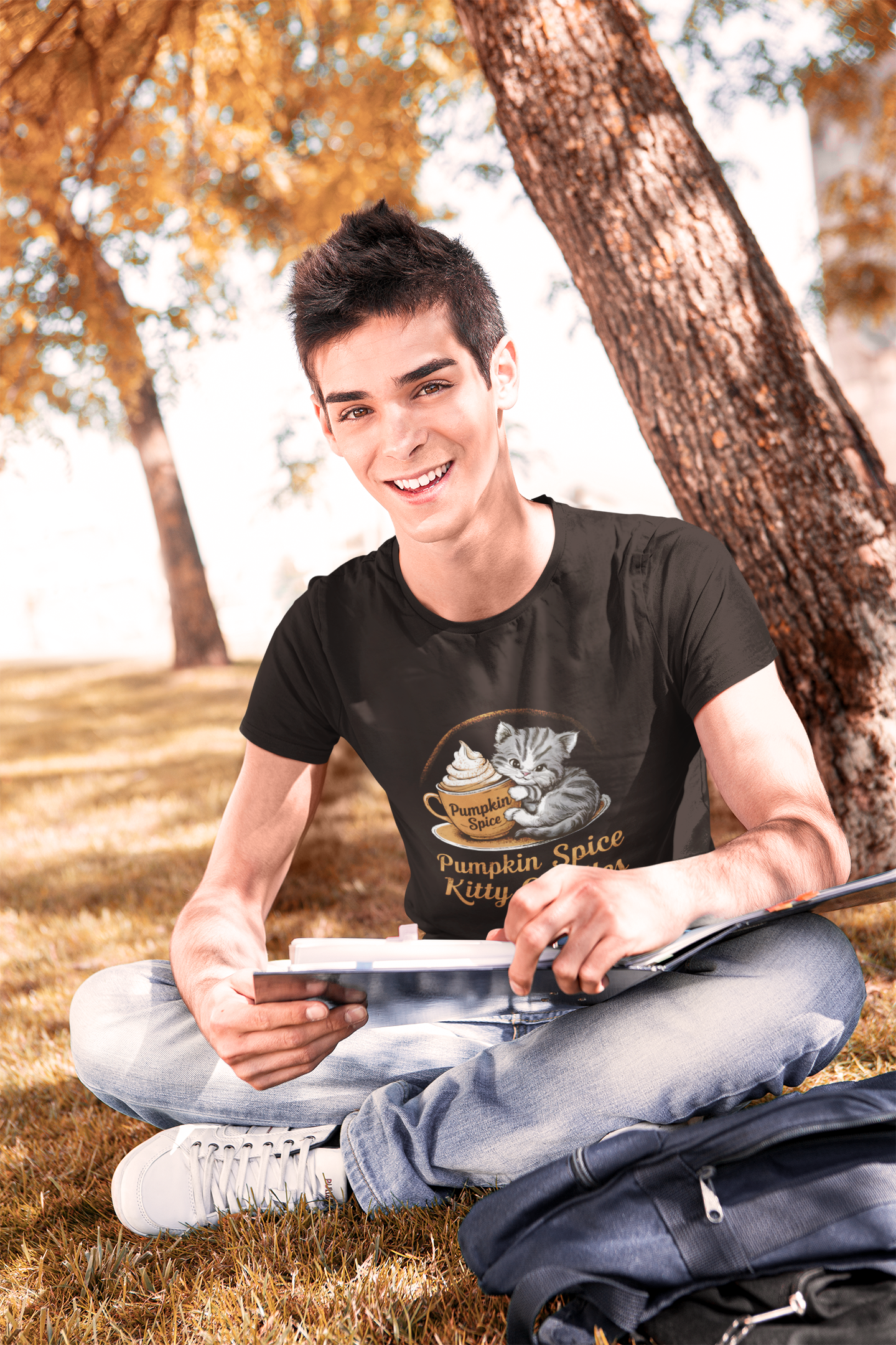 Snuggle up this fall with the "Pumpkin Spice Kitty Cuddles" t-shirt, a perfect blend of cat love and autumn vibes. Ideal for cat lovers and pumpkin spice enthusiasts, this cozy design is great for enjoying crisp air and warm beverages in October and November.
