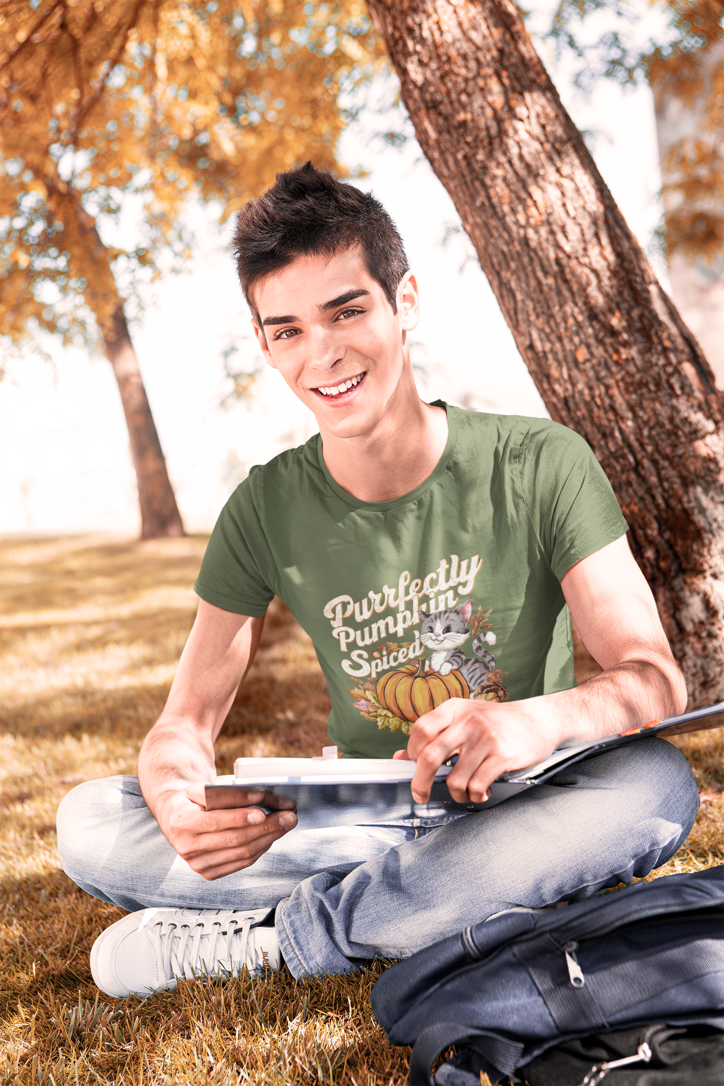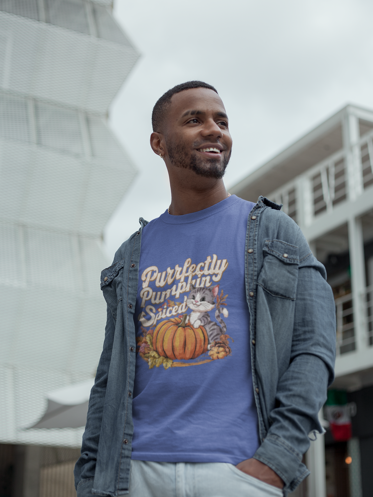 Embrace the cozy fall season with the "Purr-fectly Pumpkin Spiced" t-shirt, ideal for cat and pumpkin spice lovers alike. This witty and warm design is perfect for autumn outings and makes a great gift for those who cherish the crisp air and cozy beverages of October and November.