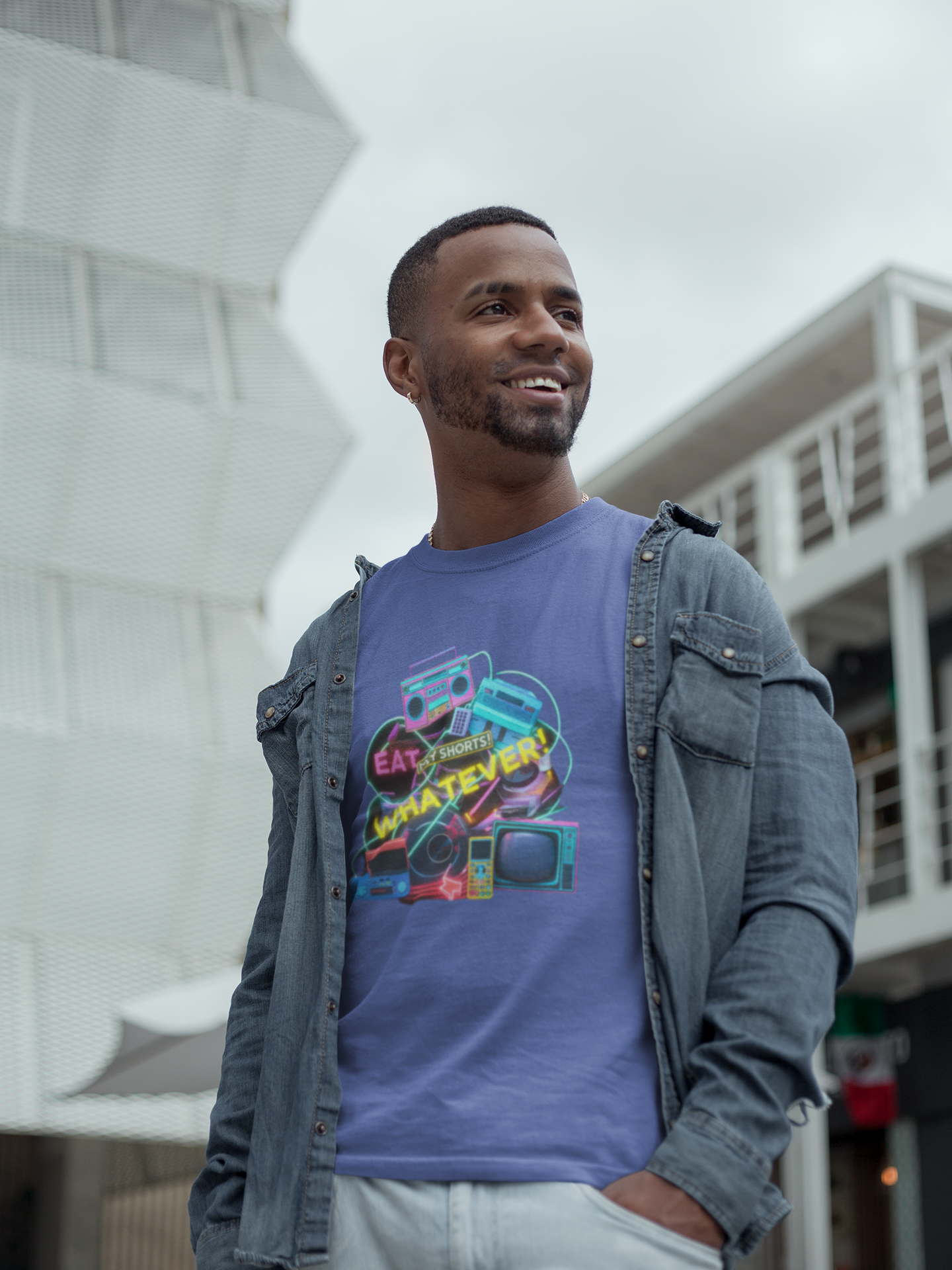 Relive the vibrant 1990s with this "90s Throwback" t-shirt, ideal for both Gen Z and Millennials. Featuring playful and eclectic graphics, including boomboxes and handheld gaming devices, and iconic phrases like "Whatever" and "Eat my Shorts," this bold and colorful design captures the funky, nostalgic spirit of the era.