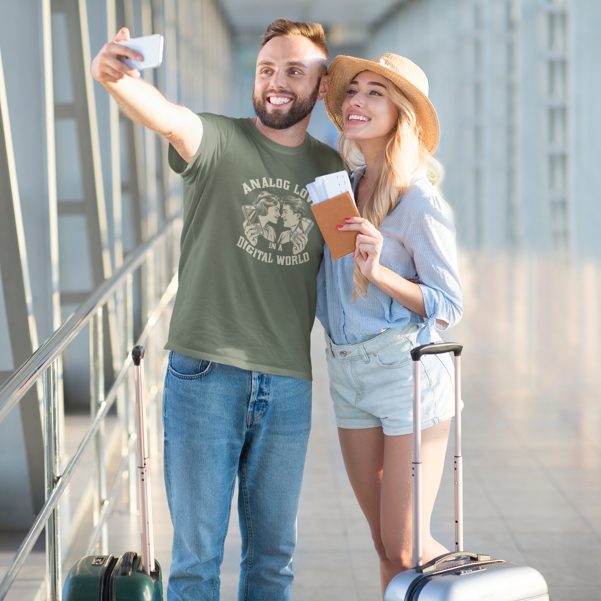 This "Analog Love in a Digital World" design blends retro nostalgia with modern technology in a playful, mid-century modern style. The illustration captures the humorous contrast between love and communication in the digital age.