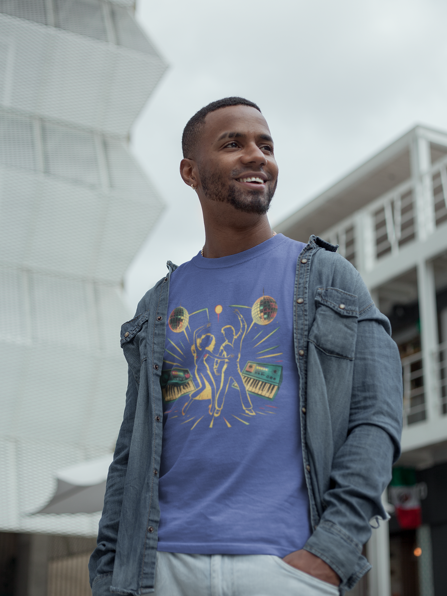This retro disco design features a gold-glow duo dancing vibrantly with synthesizers and keyboards setting the musical backdrop. Perfect for disco lovers, this lively and energetic piece captures the fun and fashion of the 1970s.
