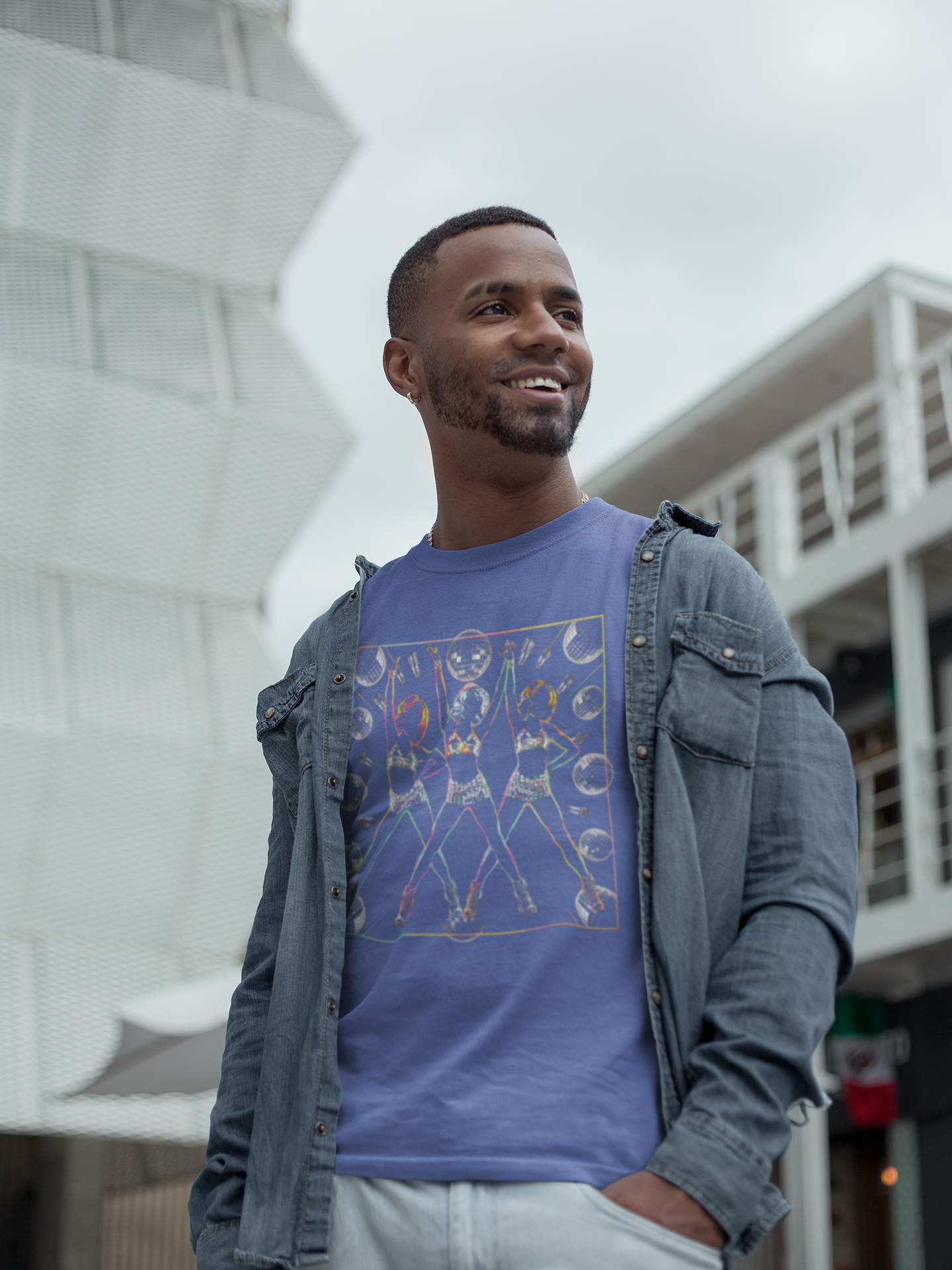 This retro disco ladies design showcases vibrant, colorful silhouettes dancing to the beat of pop art music, complete with a mirror ball and glittery accents. Perfect for parties, nightlife, and disco fashion enthusiasts.