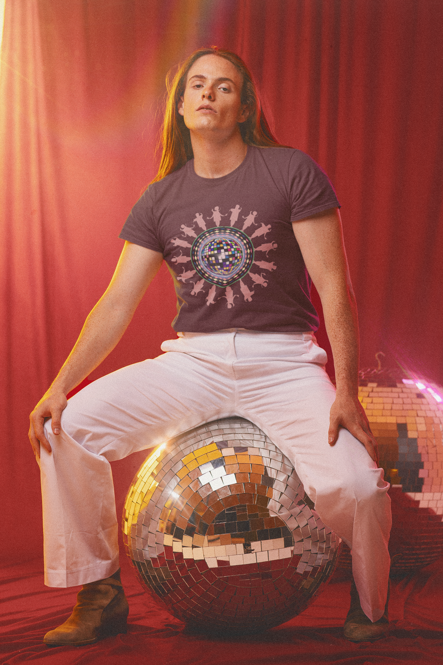 This design captures the vibrant energy of a retro disco party, with colorful mirrorball world and dynamic silhouettes of people dancing. Perfect for anyone who loves the groovy fashion and funky vibes of the 1970s.